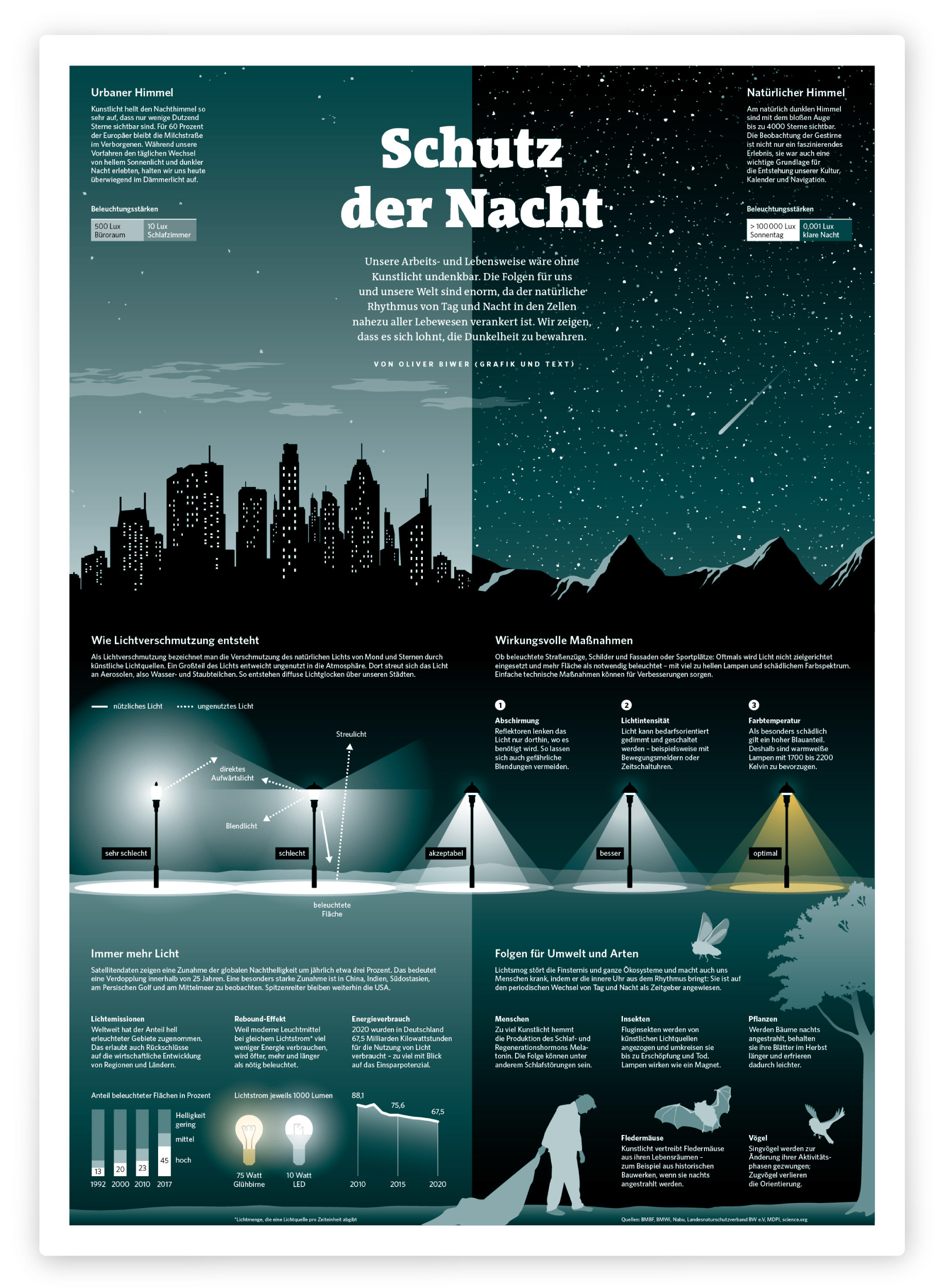 Unsere Arbeits- und Lebensweise wäre ohne Kunstlicht undenkbar. Die Folgen für uns und unsere Welt sind enorm, da der natürliche Rhythmus von Tag und Nacht in den Zellen nahezu aller Lebewesen verankert ist. Diese Grafik erklärt, wie Lichtverschmutzung entsteht und mit welch einfachen Maßnahmen sie reduziert werden kann. Warum es sich lohnt, die Dunkelheit zu bewahren.